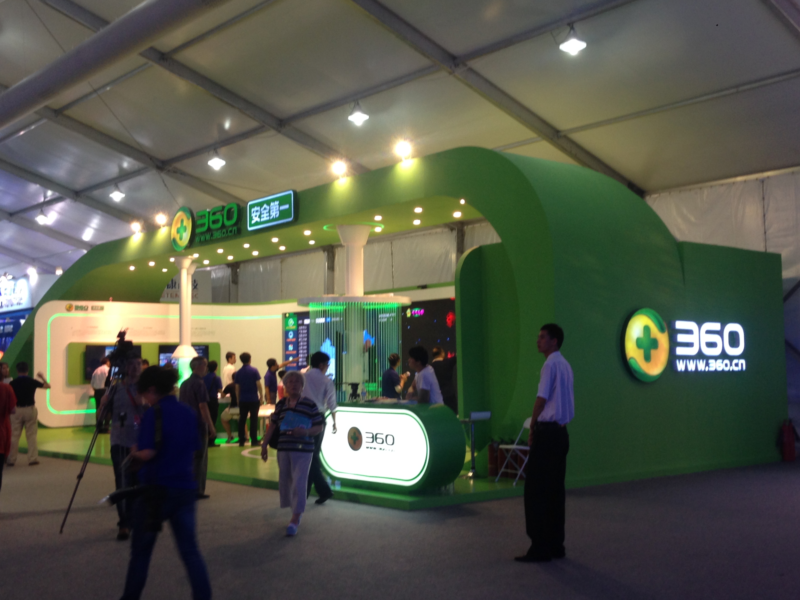 在2019年中國網絡金融展上,賽凡為360提供了展覽展示一條龍服務。360網絡安全金融展臺劃分為洽談區與展示區域,隔斷的劃分,讓展品的展示效果得到最好發揮,也增加了立體感。賽凡為了保證燈光照明效果,將照明集中在展臺中部,并在展臺外部設置照明器材,吊頂以及外部的燈光,燈帶,貫穿整個區域;使得燈光不刺眼且讓展臺得到充足的光線。
