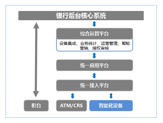智能銀行網點系統通過統一接入平臺接入設備終端,通過應用平臺接入和配置業務,通過運營管理系統實現對設備、業務、廳堂人員的統一運營和管理。